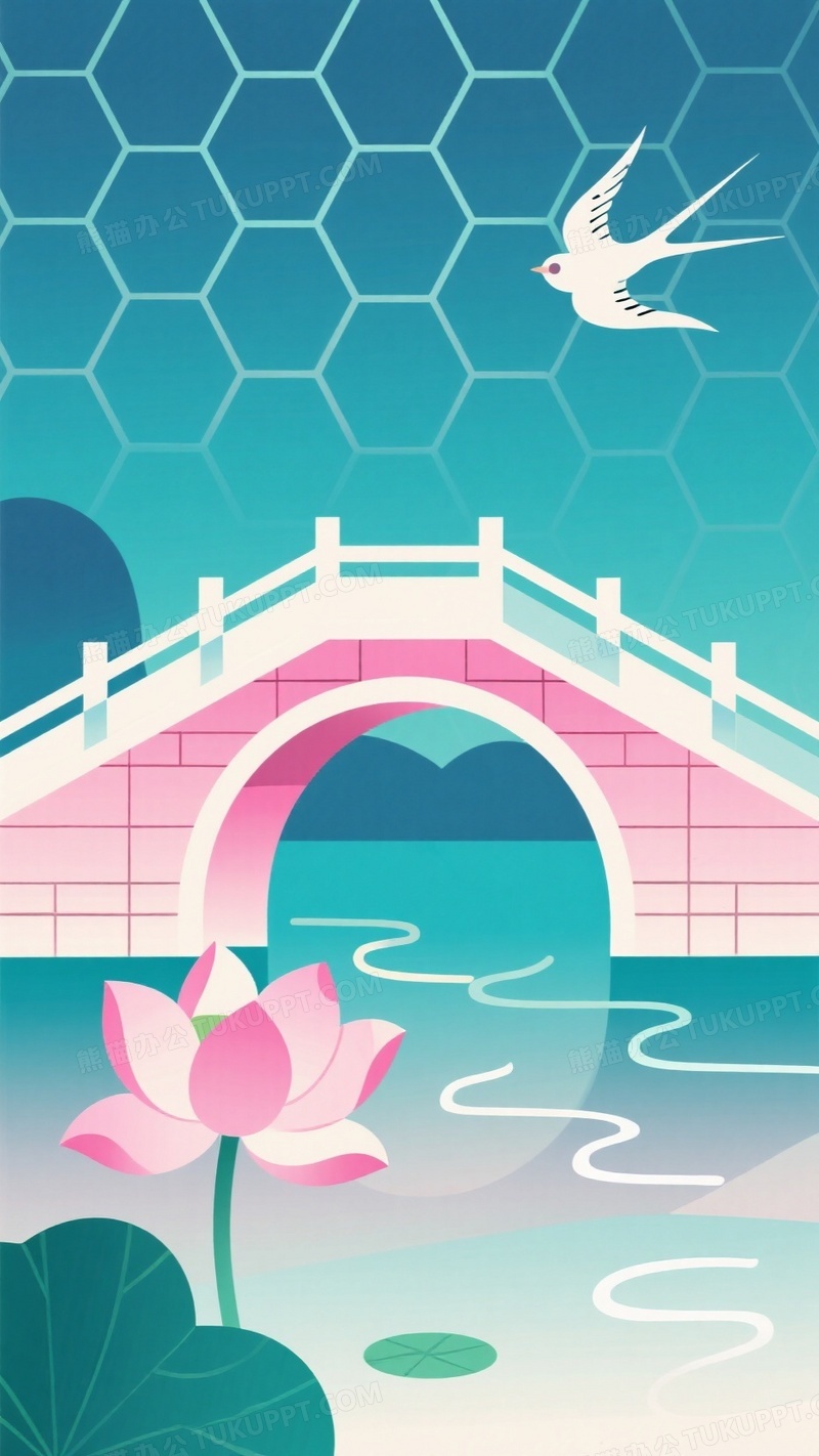 本作品内容为扁平矢量插画设计几何化断桥造型搭配渐变粉荷, 格式为 jpg, 大小1 MB, 图片尺寸为936 x 1664, 源文件无水印, 欢迎使用熊猫办公。 如认为平台内容涉嫌侵权,可通过邮件:tousu@tukuppt.com提出书面通知,我们将及时处理。
