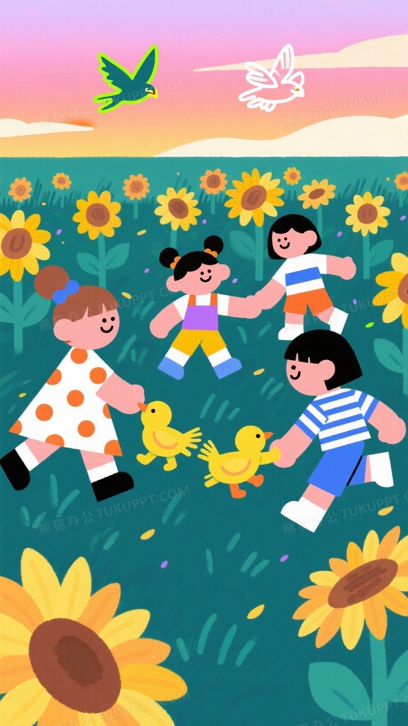 本作品内容为矢量扁平化构图五个孩童在向日葵花田玩老鹰捉小鸡, 格式为 jpg, 大小1 MB, 图片尺寸为936 x 1664, 源文件无水印, 欢迎使用熊猫办公。 如认为平台内容涉嫌侵权,可通过邮件:tousu@tukuppt.com提出书面通知,我们将及时处理。