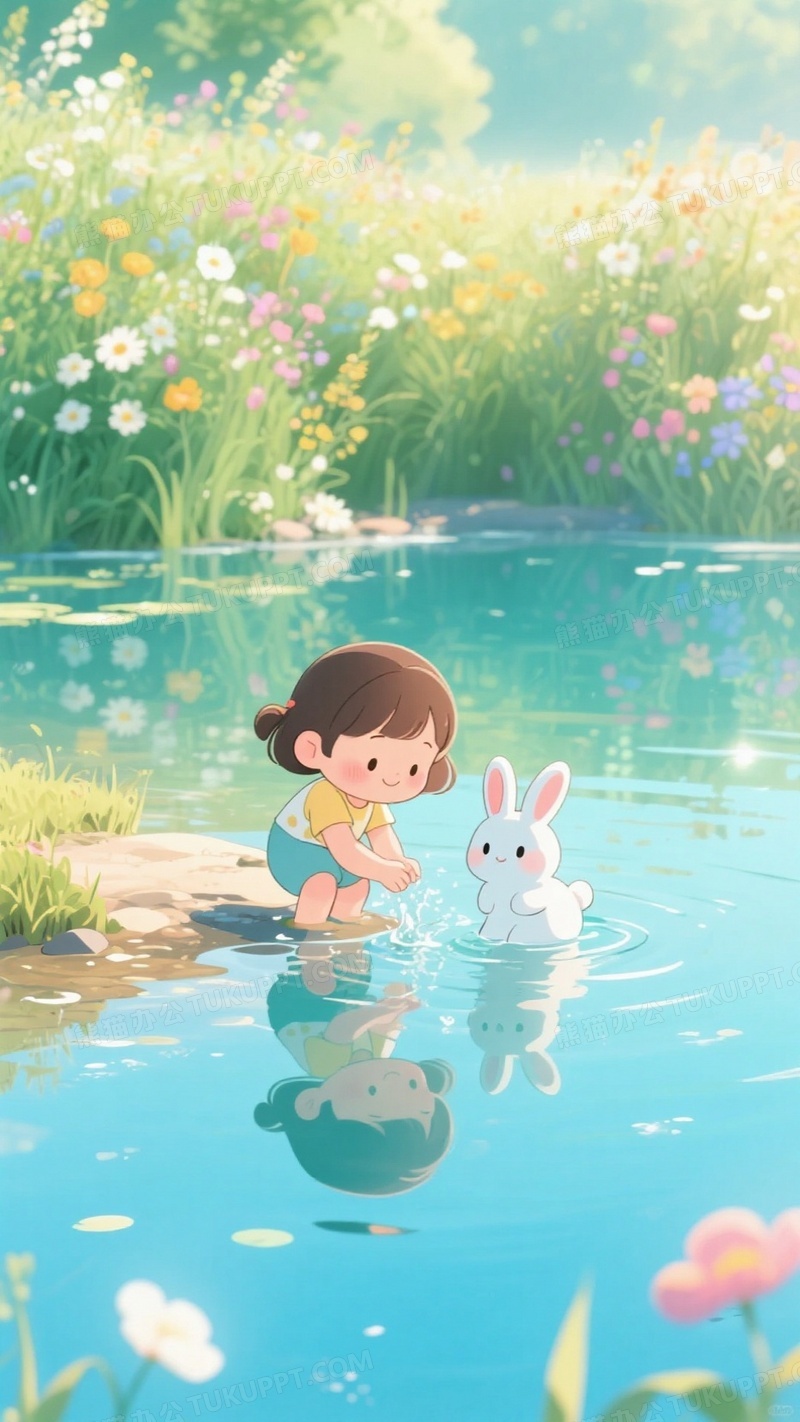 本作品内容为夏日卡通风格插画可爱小女孩和一只小兔子在湖边的浅滩玩水, 格式为 jpg, 大小1 MB, 图片尺寸为936 x 1664, 源文件无水印, 欢迎使用熊猫办公。 如认为平台内容涉嫌侵权,可通过邮件:tousu@tukuppt.com提出书面通知,我们将及时处理。