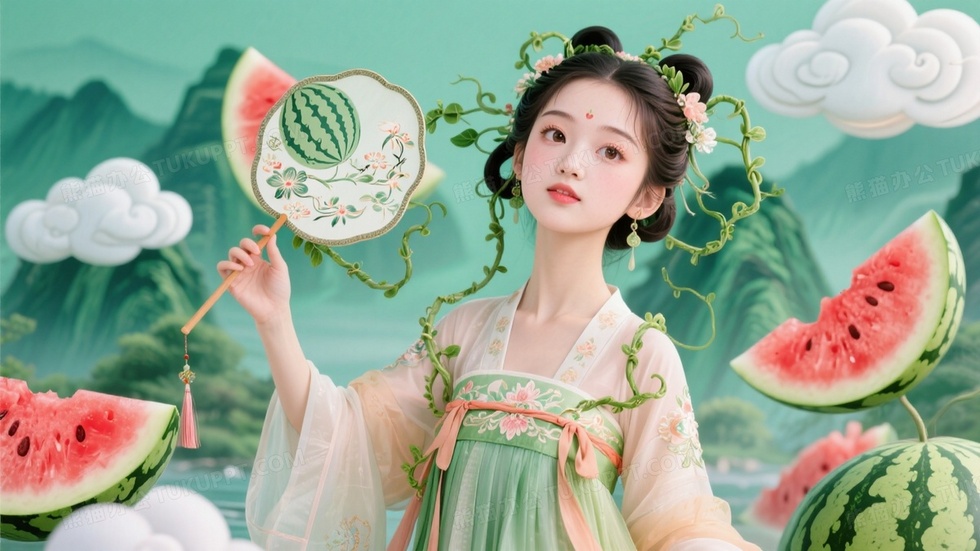 本作品内容为国潮风格西瓜仙子汉元素襦裙少女手持西瓜团扇, 格式为 jpg, 大小1 MB, 图片尺寸为1664 x 936, 源文件无水印, 欢迎使用熊猫办公。 如认为平台内容涉嫌侵权,可通过邮件:tousu@tukuppt.com提出书面通知,我们将及时处理。