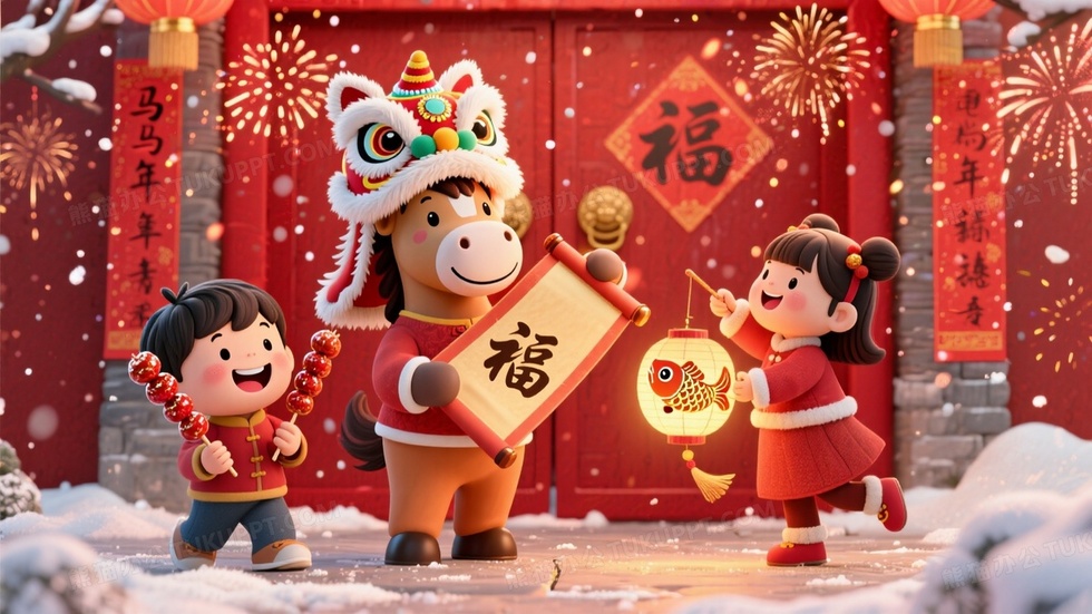 本作品内容为马年新春拜年贺岁场景, 格式为 jpg, 大小1 MB, 图片尺寸为1664 x 936, 源文件无水印, 欢迎使用熊猫办公。 如认为平台内容涉嫌侵权,可通过邮件:tousu@tukuppt.com提出书面通知,我们将及时处理。