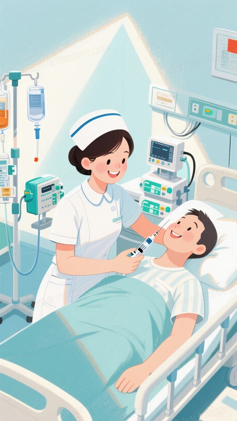 本作品内容为医院主题的科普插画护士微笑着给患者打针, 格式为 jpg, 大小1 MB, 图片尺寸为936 x 1664, 源文件无水印, 欢迎使用熊猫办公。 如认为平台内容涉嫌侵权,可通过邮件:tousu@tukuppt.com提出书面通知,我们将及时处理。