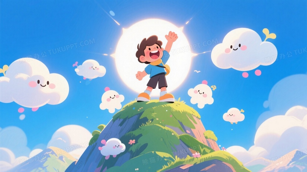 本作品内容为卡通插画风格角色登上山顶欢快地振臂高呼, 格式为 jpg, 大小1 MB, 图片尺寸为1664 x 936, 源文件无水印, 欢迎使用熊猫办公。 如认为平台内容涉嫌侵权,可通过邮件:tousu@tukuppt.com提出书面通知,我们将及时处理。