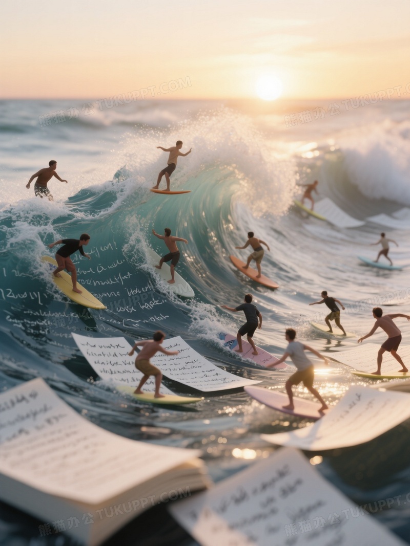 本作品内容为微观视角微距拍摄多个人在在写满文字的书纸组成的海浪中冲浪, 格式为 jpg, 大小1 MB, 图片尺寸为1104 x 1472, 源文件无水印, 欢迎使用熊猫办公。 如认为平台内容涉嫌侵权,可通过邮件:tousu@tukuppt.com提出书面通知,我们将及时处理。