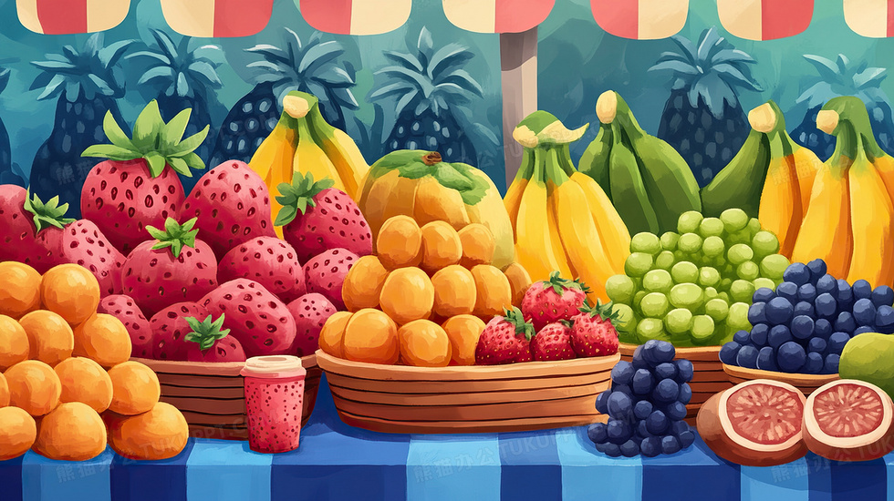 本作品内容为卡通风摊位上的水果插画, 格式为 jpg, 大小3 MB, 图片尺寸为2912 x 1632, 源文件无水印, 欢迎使用熊猫办公。 如认为平台内容涉嫌侵权,可通过邮件:tousu@tukuppt.com提出书面通知,我们将及时处理。