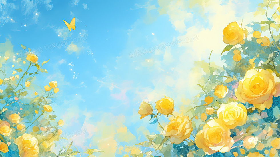 本作品内容为黄色唯美水彩风玫瑰花蝴蝶插画, 格式为 jpg, 大小4 MB, 图片尺寸为2912 x 1632, 源文件无水印, 欢迎使用熊猫办公。 如认为平台内容涉嫌侵权,可通过邮件:tousu@tukuppt.com提出书面通知,我们将及时处理。