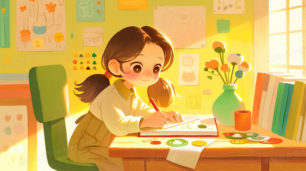 本作品内容为书房学习绘画小女孩卡通插画, 格式为 jpg, 大小3 MB, 图片尺寸为2912 x 1632, 源文件无水印, 欢迎使用熊猫办公。 如认为平台内容涉嫌侵权,可通过邮件:tousu@tukuppt.com提出书面通知,我们将及时处理。