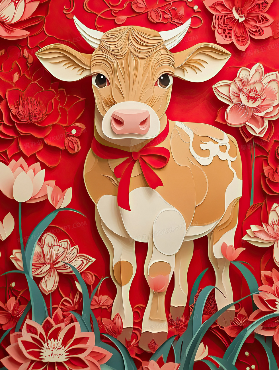 本作品内容为红色剪纸风生肖牛新年插画, 格式为 jpg, 大小4 MB, 图片尺寸为1856 x 2464, 源文件无水印, 欢迎使用熊猫办公。 如认为平台内容涉嫌侵权,可通过邮件:tousu@tukuppt.com提出书面通知,我们将及时处理。