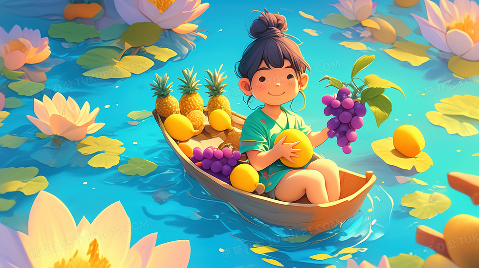 本作品内容为荷塘船只卡通女孩水果插画, 格式为 jpg, 大小3 MB, 图片尺寸为2912 x 1632, 源文件无水印, 欢迎使用熊猫办公。 如认为平台内容涉嫌侵权,可通过邮件:tousu@tukuppt.com提出书面通知,我们将及时处理。