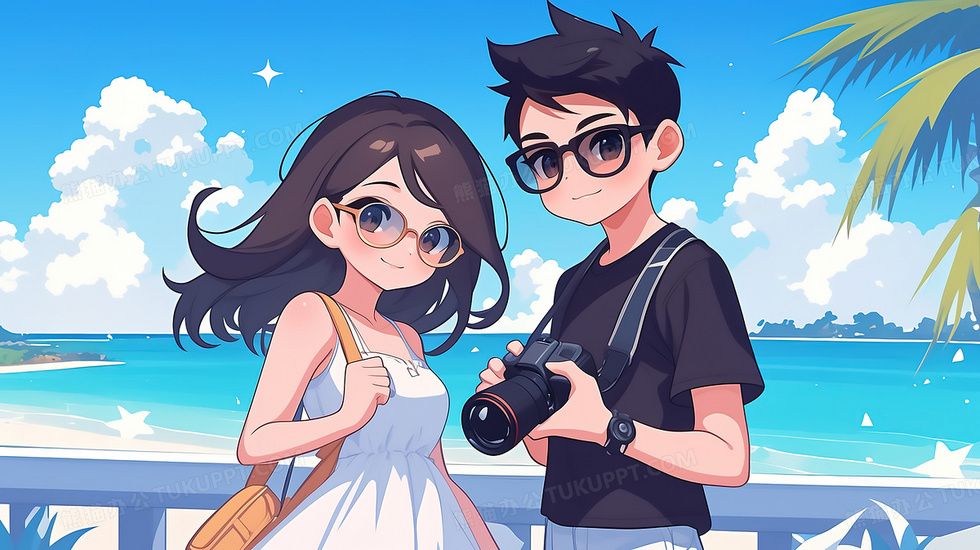 本作品内容为卡通一对情侣海边度假拍照插画, 格式为 jpg, 大小3 MB, 图片尺寸为2912 x 1632, 源文件无水印, 欢迎使用熊猫办公。 如认为平台内容涉嫌侵权,可通过邮件:tousu@tukuppt.com提出书面通知,我们将及时处理。