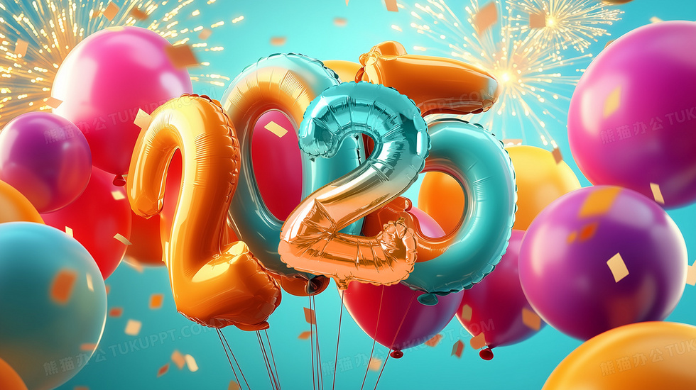 本作品内容为2025气球数字组合的创意插画, 格式为 jpg, 大小6 MB, 图片尺寸为2912 x 1632, 源文件无水印, 欢迎使用熊猫办公。 如认为平台内容涉嫌侵权,可通过邮件:tousu@tukuppt.com提出书面通知,我们将及时处理。