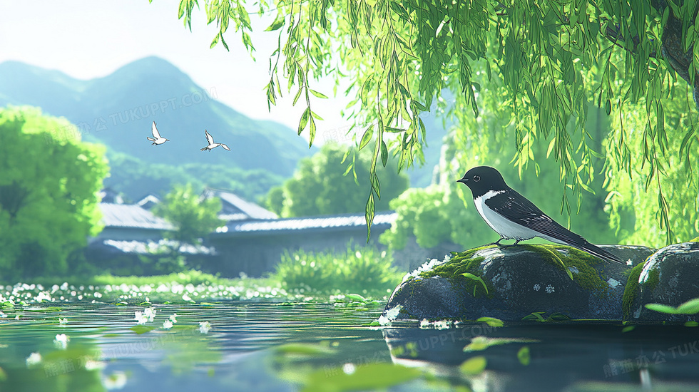 本作品内容为春季户外山谷间柳树与燕子插画, 格式为 jpg, 大小4 MB, 图片尺寸为2912 x 1632, 源文件无水印, 欢迎使用熊猫办公。 如认为平台内容涉嫌侵权,可通过邮件:tousu@tukuppt.com提出书面通知,我们将及时处理。