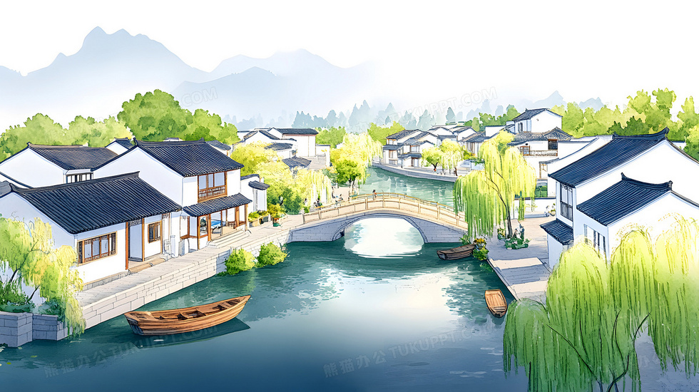 本作品内容为插画风格江南唯美风光水乡小桥小船, 格式为 jpg, 大小3 MB, 图片尺寸为2912 x 1632, 源文件无水印, 欢迎使用熊猫办公。 如认为平台内容涉嫌侵权,可通过邮件:tousu@tukuppt.com提出书面通知,我们将及时处理。