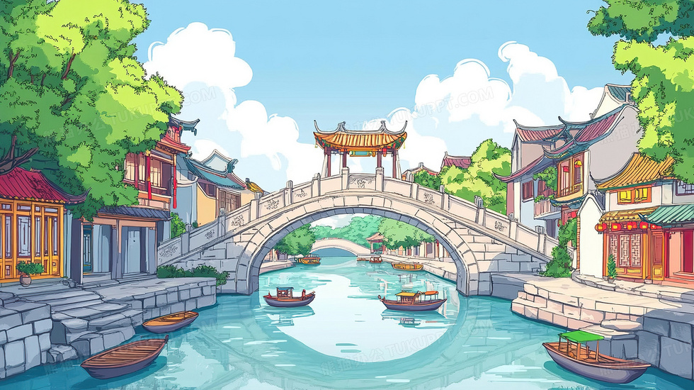 本作品内容为卡通风江南的桥插画, 格式为 jpg, 大小4 MB, 图片尺寸为2912 x 1632, 源文件无水印, 欢迎使用熊猫办公。 如认为平台内容涉嫌侵权,可通过邮件:tousu@tukuppt.com提出书面通知,我们将及时处理。