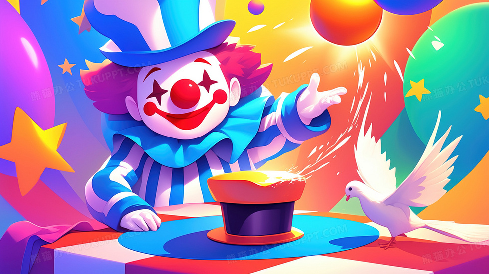 本作品内容为在舞台表演的小丑与飞鸽插画, 格式为 jpg, 大小2 MB, 图片尺寸为2912 x 1632, 源文件无水印, 欢迎使用熊猫办公。 如认为平台内容涉嫌侵权,可通过邮件:tousu@tukuppt.com提出书面通知,我们将及时处理。