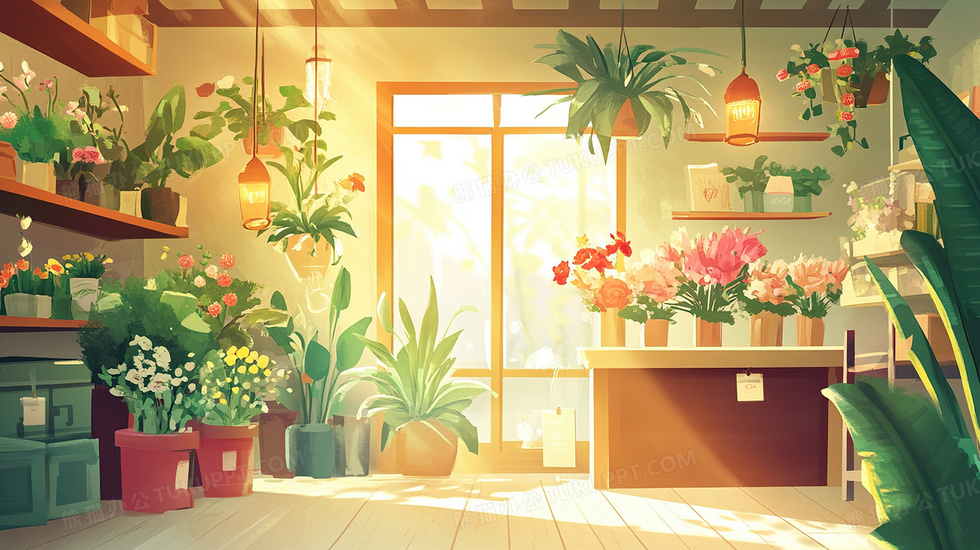 本作品内容为花店内部环境插画, 格式为 jpg, 大小3 MB, 图片尺寸为2912 x 1632, 源文件无水印, 欢迎使用熊猫办公。 如认为平台内容涉嫌侵权,可通过邮件:tousu@tukuppt.com提出书面通知,我们将及时处理。