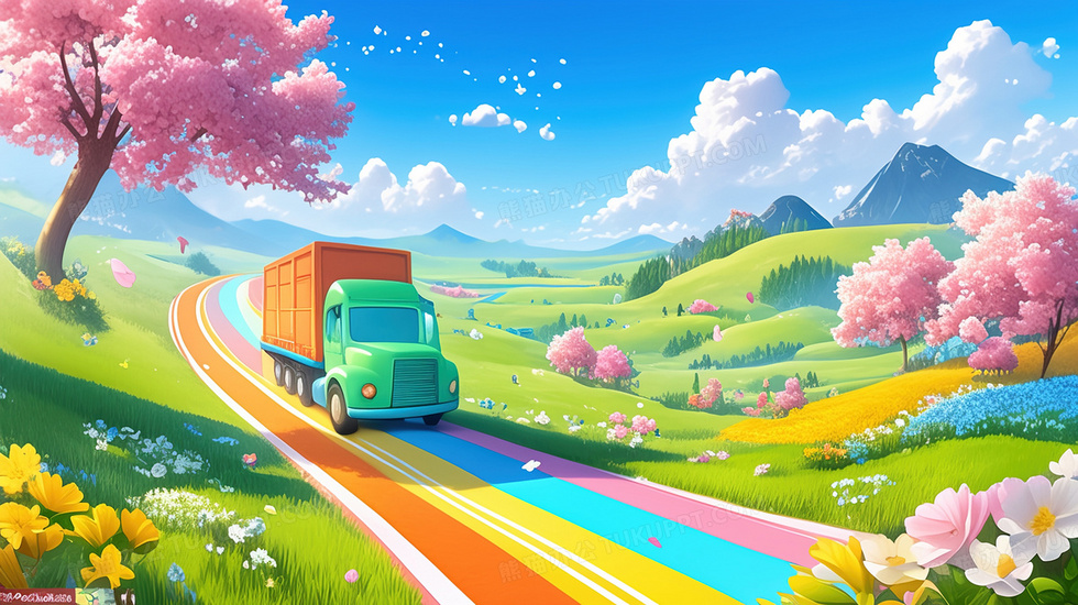 本作品内容为蓝天白云春天道路边盛开的花树行驶货车插画, 格式为 jpg, 大小3 MB, 图片尺寸为2912 x 1632, 源文件无水印, 欢迎使用熊猫办公。 如认为平台内容涉嫌侵权,可通过邮件:tousu@tukuppt.com提出书面通知,我们将及时处理。