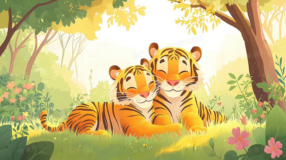 本作品内容为坐在树林草地上的两只可爱老虎插画, 格式为 jpg, 大小3 MB, 图片尺寸为2912 x 1632, 源文件无水印, 欢迎使用熊猫办公。 如认为平台内容涉嫌侵权,可通过邮件:tousu@tukuppt.com提出书面通知,我们将及时处理。