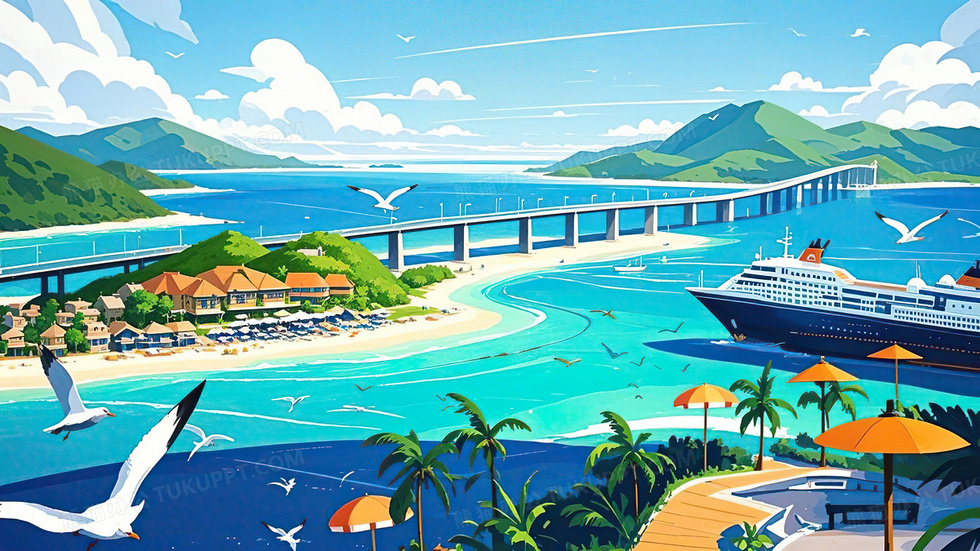 本作品内容为大海海岛风景轮船海鸥跨海大桥插画, 格式为 jpg, 大小5 MB, 图片尺寸为3072 x 1728, 源文件无水印, 欢迎使用熊猫办公。 如认为平台内容涉嫌侵权,可通过邮件:tousu@tukuppt.com提出书面通知,我们将及时处理。