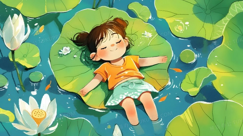 本作品内容为唯美清新小女孩躺在荷叶上插画, 格式为 jpg, 大小3 MB, 图片尺寸为2912 x 1632, 源文件无水印, 欢迎使用熊猫办公。 如认为平台内容涉嫌侵权,可通过邮件:tousu@tukuppt.com提出书面通知,我们将及时处理。