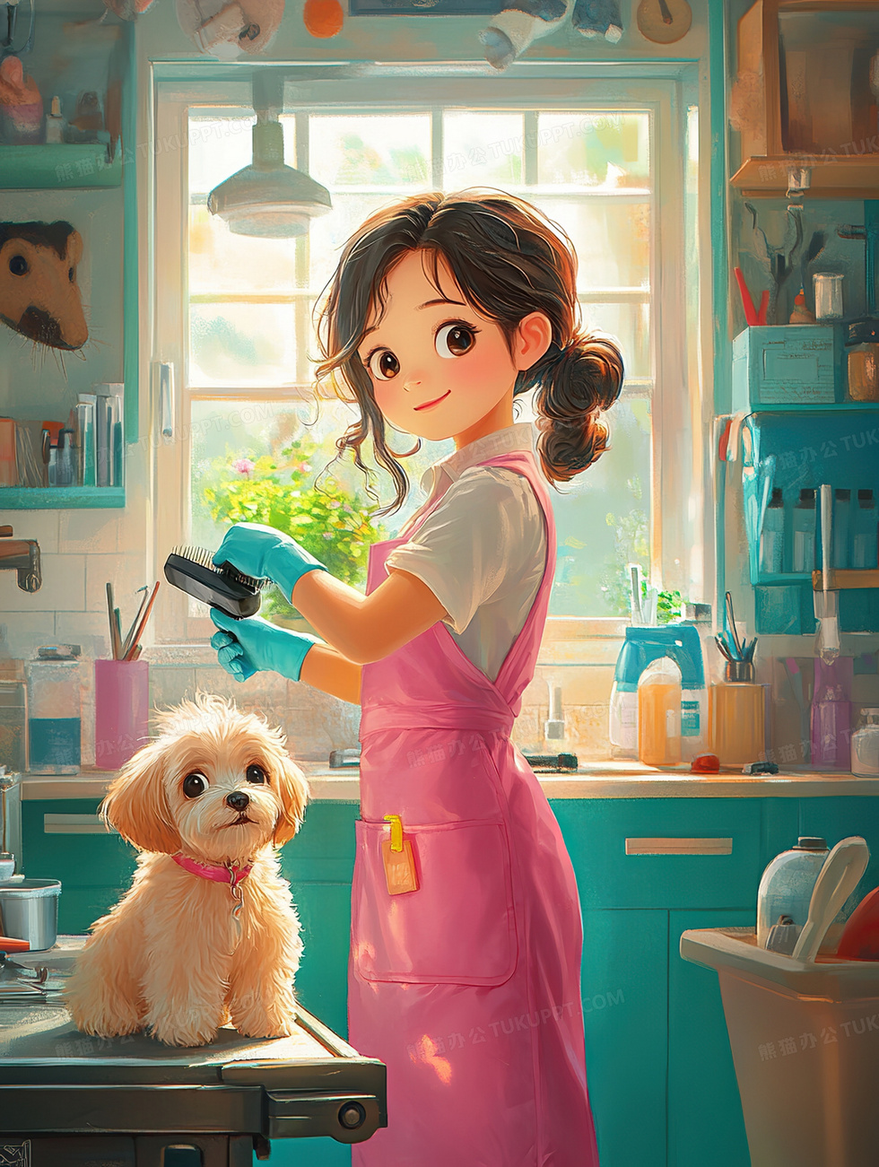 本作品内容为一个宠物美容师插画, 格式为 jpg, 大小3 MB, 图片尺寸为1856 x 2464, 源文件无水印, 欢迎使用熊猫办公。 如认为平台内容涉嫌侵权,可通过邮件:tousu@tukuppt.com提出书面通知,我们将及时处理。