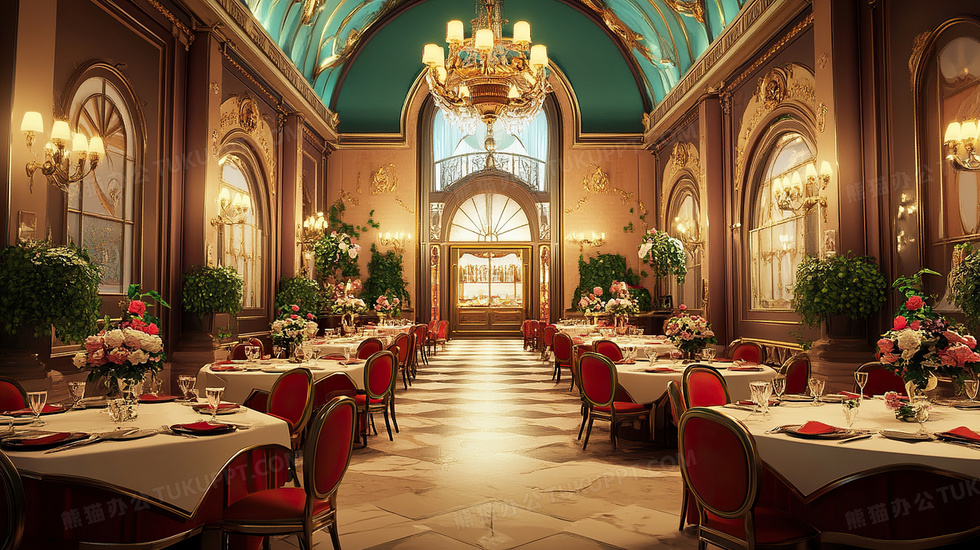 本作品内容为酒楼里的宴会厅插画, 格式为 jpg, 大小4 MB, 图片尺寸为2912 x 1632, 源文件无水印, 欢迎使用熊猫办公。 如认为平台内容涉嫌侵权,可通过邮件:tousu@tukuppt.com提出书面通知,我们将及时处理。