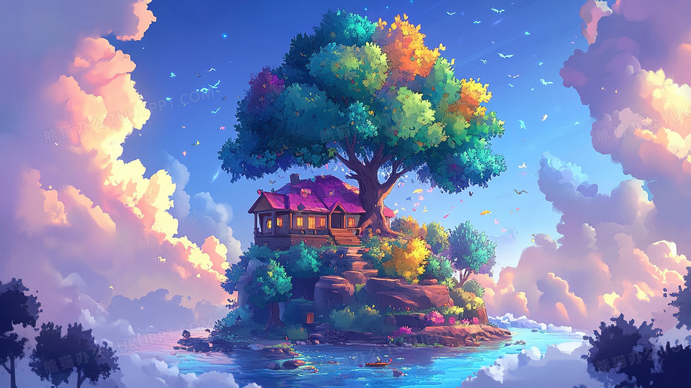 本作品内容为海岛木屋唯美壁纸风景插画, 格式为 jpg, 大小4 MB, 图片尺寸为2912 x 1632, 源文件无水印, 欢迎使用熊猫办公。 如认为平台内容涉嫌侵权,可通过邮件:tousu@tukuppt.com提出书面通知,我们将及时处理。