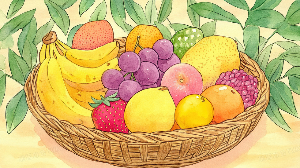 首页 > 插画 > 科技艺术 > 水彩手绘 > 篮子里装着各种美味的水果插画