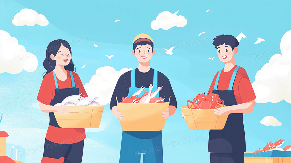 本作品内容为卡通渔业捕鱼渔民背景, 格式为 jpg, 大小1 MB, 图片尺寸为2912 x 1632, 作品中背景图片无需修改, 源文件无水印,可以直接使用, 欢迎使用熊猫办公。 如认为平台内容涉嫌侵权,可通过邮件:tousu@tukuppt.com提出书面通知,我们将及时处理。