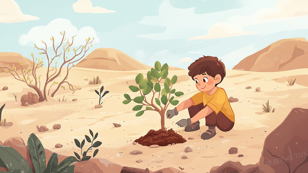 本作品内容为卡通风格沙漠种树的可爱男孩插画, 格式为 jpg, 大小3 MB, 图片尺寸为2912 x 1632, 源文件无水印, 欢迎使用熊猫办公。 如认为平台内容涉嫌侵权,可通过邮件:tousu@tukuppt.com提出书面通知,我们将及时处理。