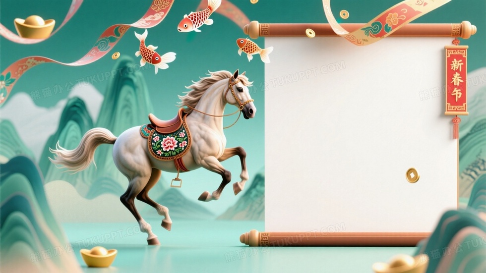 本作品内容为新春贺岁背景设计矫健的蒙古马完整的出现在图片中左侧或者右侧区域, 格式为 jpg, 大小1 MB, 图片尺寸为1664 x 936, 作品中背景图片无需修改, 源文件无水印,可以直接使用, 欢迎使用熊猫办公。 如认为平台内容涉嫌侵权,可通过邮件:tousu@tukuppt.com提出书面通知,我们将及时处理。