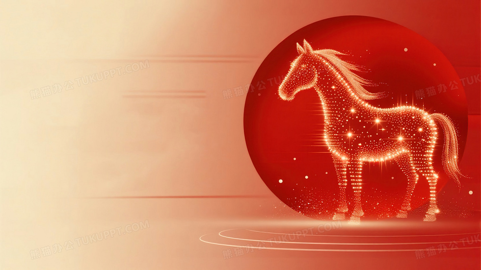 本作品内容为红色简约金色粒子发光马新年背景图, 格式为 jpg, 大小5 MB, 图片尺寸为3328 x 1872, 作品中背景图片无需修改, 源文件无水印,可以直接使用, 欢迎使用熊猫办公。 如认为平台内容涉嫌侵权,可通过邮件:tousu@tukuppt.com提出书面通知,我们将及时处理。