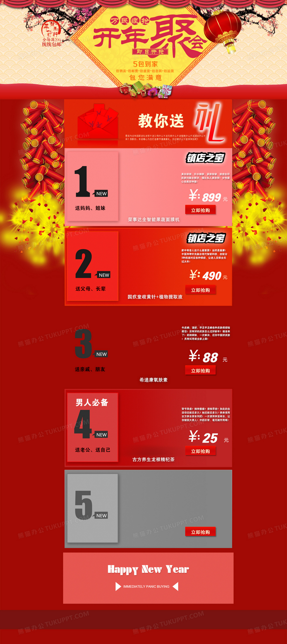 本作品内容为红色中国风年货节首页背景, 格式为 psd, 图片尺寸为1920 x 4300, 作品中背景图片无需修改, 源文件无水印,可以直接使用, 欢迎使用熊猫办公。 如认为平台内容涉嫌侵权,可通过邮件:tousu@tukuppt.com提出书面通知,我们将及时处理。