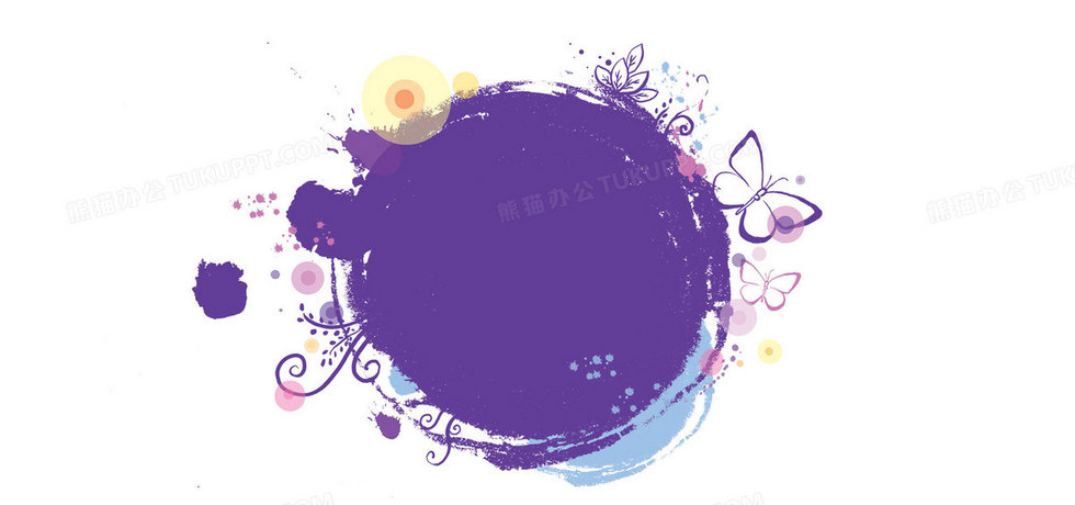 本作品内容为紫色圆形和墨点蝴蝶背景, 格式为 psd, 图片尺寸为1920 x 900, 作品中背景图片无需修改, 源文件无水印,可以直接使用, 欢迎使用熊猫办公。 如认为平台内容涉嫌侵权,可通过邮件:tousu@tukuppt.com提出书面通知,我们将及时处理。