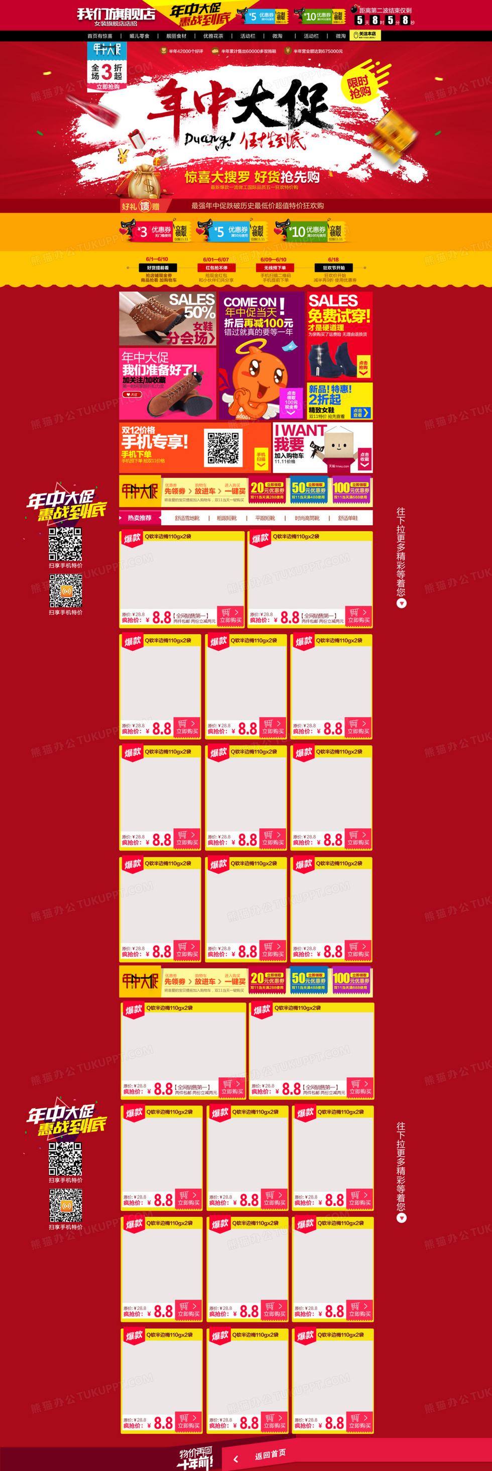 本作品内容为淘宝年中大促首页模板, 格式为 jpg, 图片尺寸为1920 x 5741, 作品中背景图片无需修改, 源文件无水印,可以直接使用, 欢迎使用熊猫办公。 如认为平台内容涉嫌侵权,可通过邮件:tousu@tukuppt.com提出书面通知,我们将及时处理。