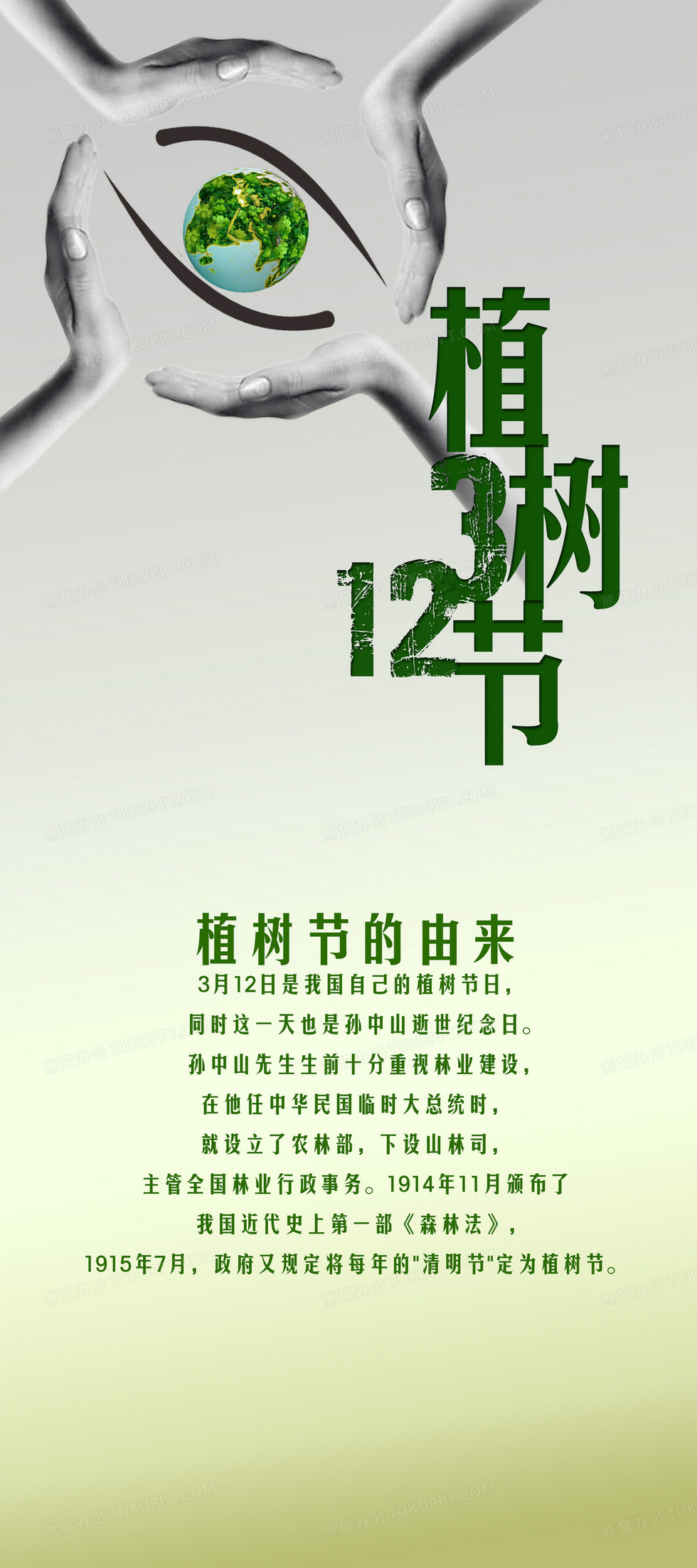 本作品内容为植树节展板活动背景, 格式为 psd, 图片尺寸为2268 x 5102, 作品中背景图片无需修改, 源文件无水印,可以直接使用, 欢迎使用熊猫办公。 如认为平台内容涉嫌侵权,可通过邮件:tousu@tukuppt.com提出书面通知,我们将及时处理。