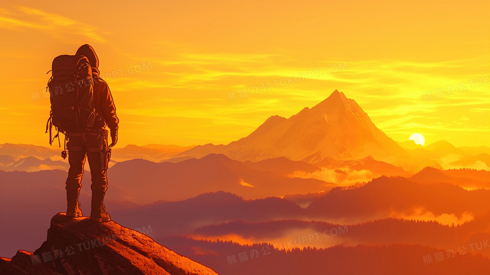 本作品内容为登山者山顶看日出人物剪影插画, 格式为 jpg, 大小2 MB, 图片尺寸为2912 x 1632, 源文件无水印, 欢迎使用熊猫办公。 如认为平台内容涉嫌侵权,可通过邮件:tousu@tukuppt.com提出书面通知,我们将及时处理。