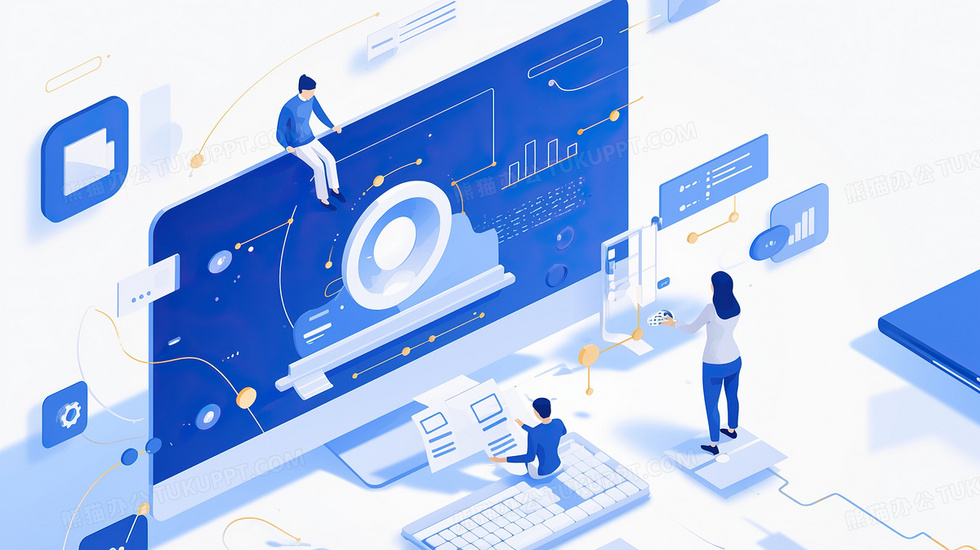 本作品内容为人们围着电脑工作交流的插画, 格式为 jpg, 大小2 MB, 图片尺寸为2912 x 1632, 源文件无水印, 欢迎使用熊猫办公。 如认为平台内容涉嫌侵权,可通过邮件:tousu@tukuppt.com提出书面通知,我们将及时处理。