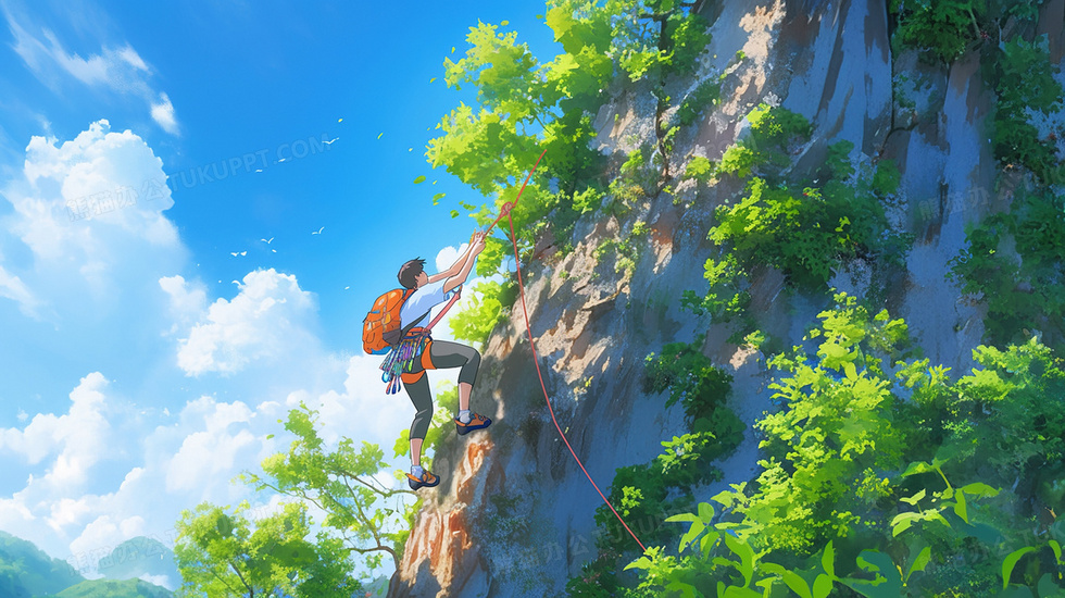 本作品内容为蓝天白云极限运动攀岩登山大自然插画, 格式为 jpg, 大小3 MB, 图片尺寸为2912 x 1632, 源文件无水印, 欢迎使用熊猫办公。 如认为平台内容涉嫌侵权,可通过邮件:tousu@tukuppt.com提出书面通知,我们将及时处理。