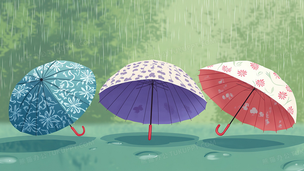 本作品内容为雨中三把花伞背景, 格式为 jpg, 大小3 MB, 图片尺寸为2912 x 1632, 作品中背景图片无需修改, 源文件无水印,可以直接使用, 欢迎使用熊猫办公。 如认为平台内容涉嫌侵权,可通过邮件:tousu@tukuppt.com提出书面通知,我们将及时处理。