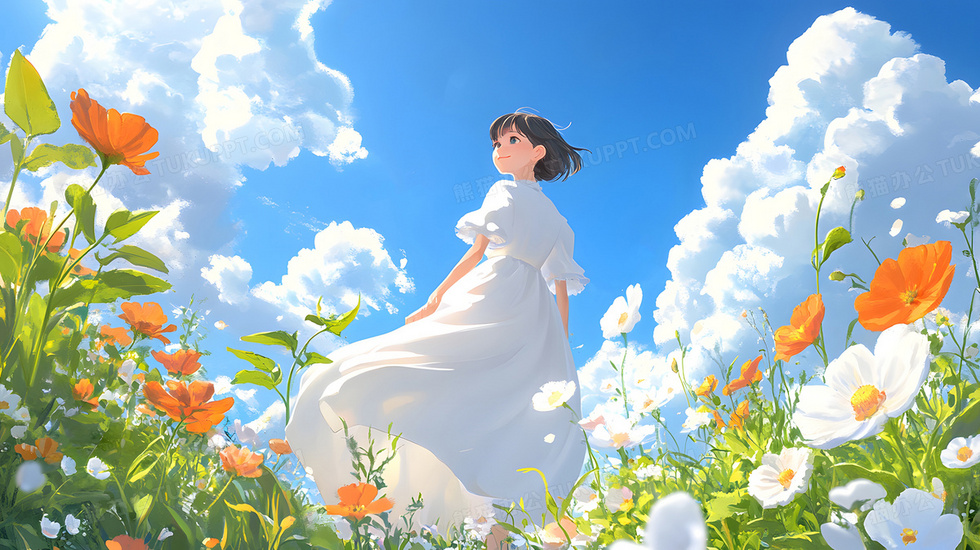 本作品内容为插画风格春季蓝天白云花朵蝴蝶美少女, 格式为 jpg, 大小3 MB, 图片尺寸为2912 x 1632, 源文件无水印, 欢迎使用熊猫办公。 如认为平台内容涉嫌侵权,可通过邮件:tousu@tukuppt.com提出书面通知,我们将及时处理。