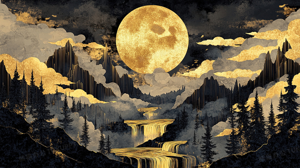 本作品内容为黑金烫金中国风山水插画, 格式为 jpg, 大小4 MB, 图片尺寸为2912 x 1632, 源文件无水印, 欢迎使用熊猫办公。 如认为平台内容涉嫌侵权,可通过邮件:tousu@tukuppt.com提出书面通知,我们将及时处理。