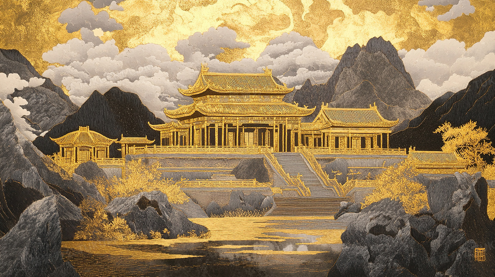 本作品内容为古建筑鎏金烫金中国风山水插画, 格式为 jpg, 大小5 MB, 图片尺寸为2912 x 1632, 源文件无水印, 欢迎使用熊猫办公。 如认为平台内容涉嫌侵权,可通过邮件:tousu@tukuppt.com提出书面通知,我们将及时处理。
