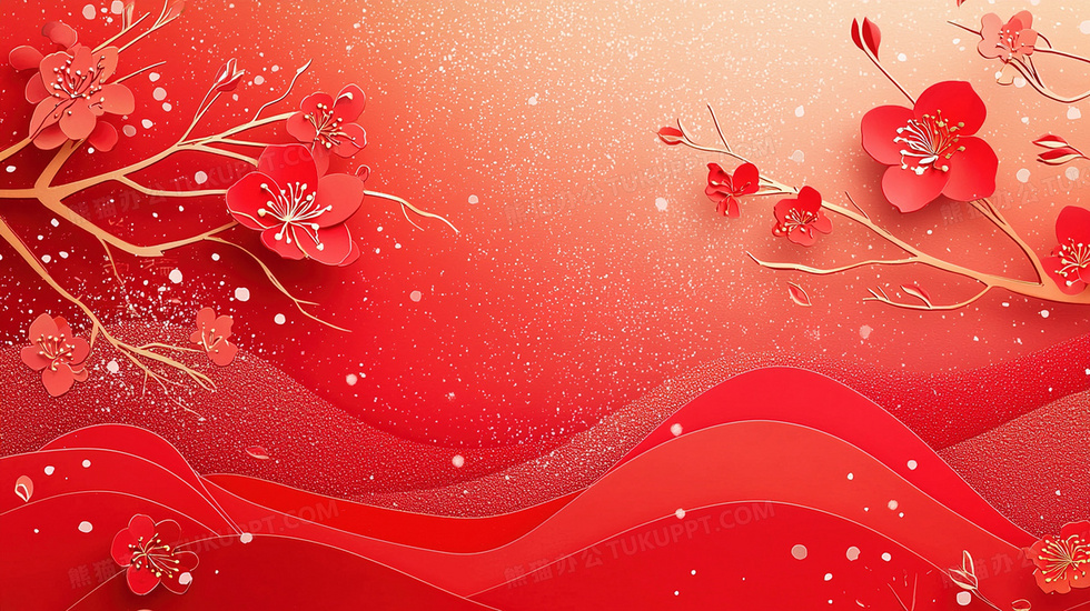 本作品内容为红金色水波纹线条梅花背景, 格式为 jpg, 大小4 MB, 图片尺寸为2912 x 1632, 作品中背景图片无需修改, 源文件无水印,可以直接使用, 欢迎使用熊猫办公。 如认为平台内容涉嫌侵权,可通过邮件:tousu@tukuppt.com提出书面通知,我们将及时处理。