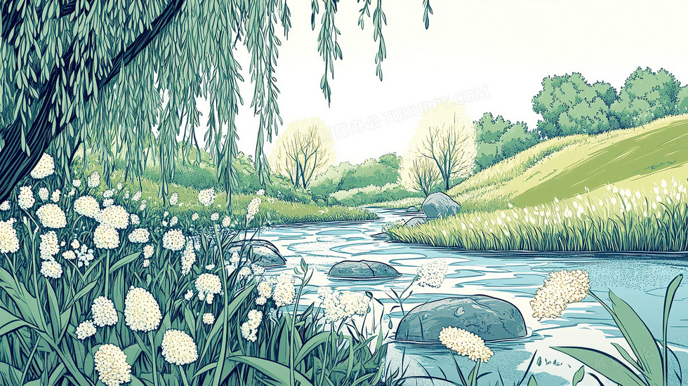 本作品内容为手绘风溪边春景插画, 格式为 jpg, 大小5 MB, 图片尺寸为2912 x 1632, 源文件无水印, 欢迎使用熊猫办公。 如认为平台内容涉嫌侵权,可通过邮件:tousu@tukuppt.com提出书面通知,我们将及时处理。