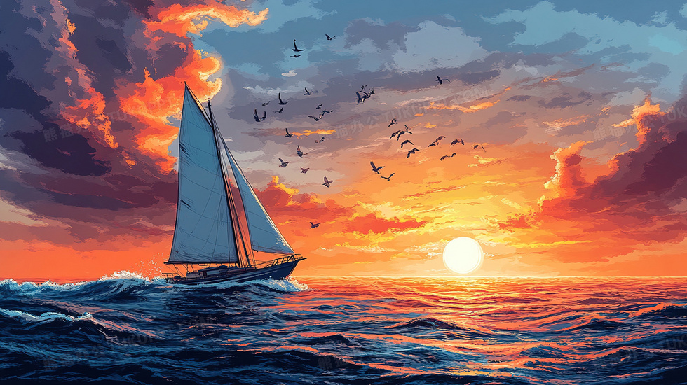 本作品内容为唯美风景日出日落海面上行驶的船插画, 格式为 jpg, 大小4 MB, 图片尺寸为2912 x 1632, 源文件无水印, 欢迎使用熊猫办公。 如认为平台内容涉嫌侵权,可通过邮件:tousu@tukuppt.com提出书面通知,我们将及时处理。