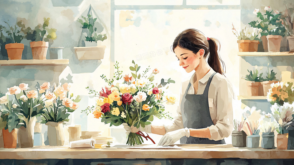 本作品内容为花店里打包花束鲜花店员女孩插画, 格式为 jpg, 大小6 MB, 图片尺寸为2912 x 1632, 源文件无水印, 欢迎使用熊猫办公。 如认为平台内容涉嫌侵权,可通过邮件:tousu@tukuppt.com提出书面通知,我们将及时处理。