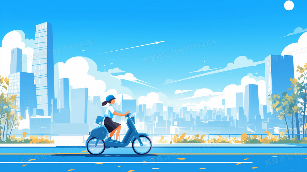 本作品内容为一个人骑新能源自行车行走在城市中插画, 格式为 jpg, 大小3 MB, 图片尺寸为2912 x 1632, 源文件无水印, 欢迎使用熊猫办公。 如认为平台内容涉嫌侵权,可通过邮件:tousu@tukuppt.com提出书面通知,我们将及时处理。