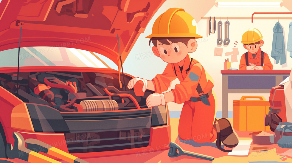 本作品内容为汽修维修工汽车修理维修插画, 格式为 jpg, 大小3 MB, 图片尺寸为2912 x 1632, 源文件无水印, 欢迎使用熊猫办公。 如认为平台内容涉嫌侵权,可通过邮件:tousu@tukuppt.com提出书面通知,我们将及时处理。