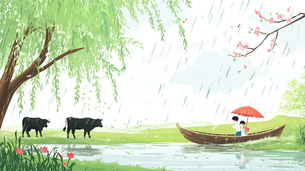 本作品内容为春雨时节小溪边人们泛舟小牛喝水的卡通插画, 格式为 jpg, 大小3 MB, 图片尺寸为2912 x 1632, 源文件无水印, 欢迎使用熊猫办公。 如认为平台内容涉嫌侵权,可通过邮件:tousu@tukuppt.com提出书面通知,我们将及时处理。